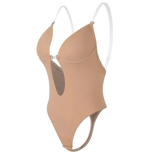 A sleek, low-profile essential designed for smooth layering under deep necklines and open-back outfits. This bodysuit features a deep V-neck and low back for a discreet fit, along with clear adjustable straps and removable padding for flexible styling. Made from soft, sculpting fabric with a thong back, it stays invisible under clothing for a clean, seamless look.
